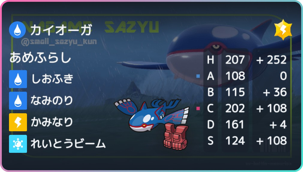 このポケモンの最も偉いポイントはその耐久値の高さから何もできないポケモンがほとんどいないというところで、シーズン通してほとんどの試合で選出しました。このルールはどれだけ禁伝の選出率を上げることができるかがとても重要だと思っているので、適切な禁伝を選択することができたかな、と思っています。テラスタイプは、ミライドンに有利になることができタイプ一致でかみなりを放つことのできる電気です。この1ヶ月でカイオーガのことをとても好きになりました。